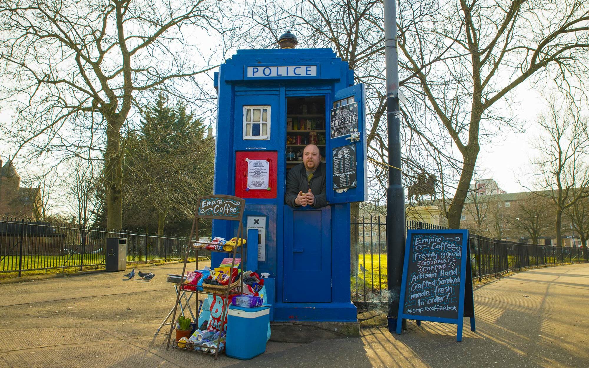 In the cities of Great Britain, I have seen these little houses painted in blue, several times. In the twentieth century, they allowed calling the police directly. The police also used them to keep in touch with their brigade, fill out a report or store first aid kits. With mobile phones, the “police box” has lost its usefulness. But the people of Glasgow are still attached to it. And I understand them! This one is very convenient for buying a takeaway coffee. In addition, if you are a fan like me of the British science fiction series Doctor Who, you cannot walk past a police box without smiling. As it happens, this salesman might be the reincarnation of Dr. Who aboard the Tardis!