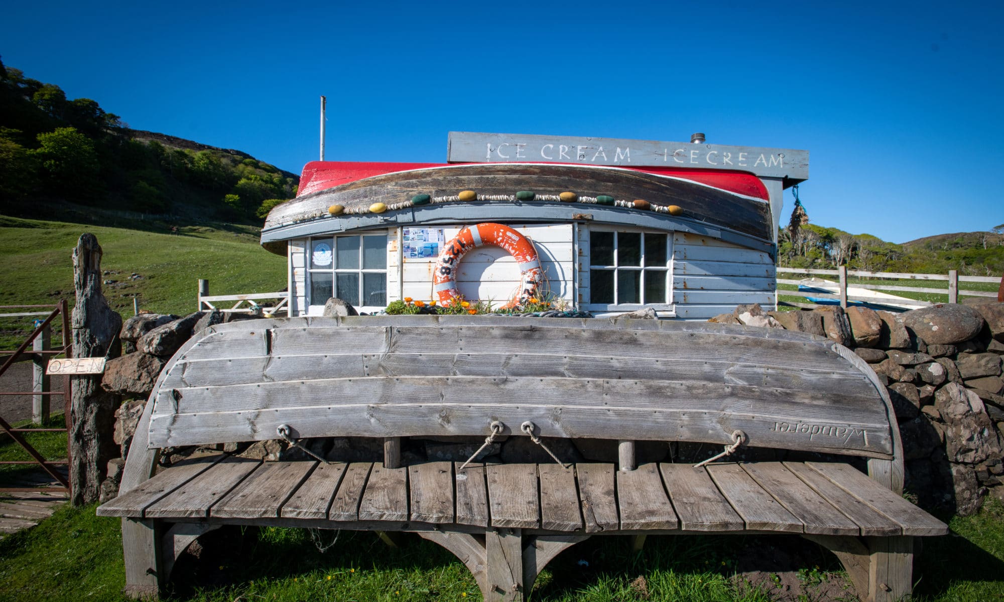 In general, people associate ice cream with hot summer days. But in Scotland, a simple ray of sun is enough to convince us to enjoy a good iced cone! In addition, on the Isle of Mull, we know how to make excellent ice cream. Made with island milk, Mull’s “Ice Cream” is renowned for its creaminess. So, sitting on this boat converted into a bench, facing the beautiful Calgary bay, an ice cream is needed. With the sun on my face and the Calgary beach in front of my eyes, I find that I could do with another helping of this ice cream!