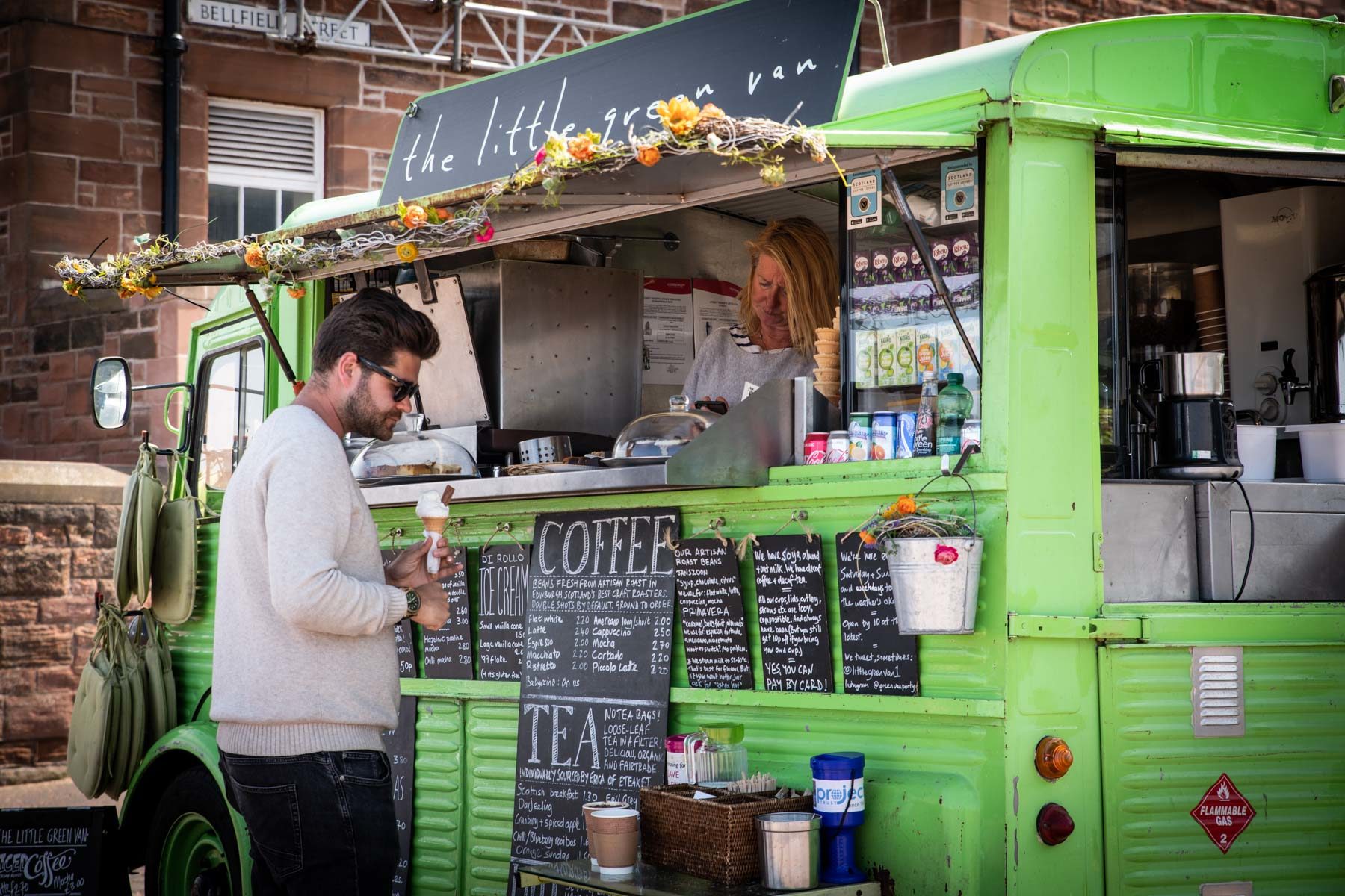 Edinburgh has its beach, it’s called Portobello Beach. It is 5 miles from Waverley Station. To get there, I took the bus. Twenty minutes later, I walk on the promenade. At the foot of Bellfield Street, I see this vintage van. Selling ice cream! Whether it’s raining, windy, or snowing, we eating ice cream in Scotland. It must be said that if we waited for it to be 30°C, we would eat less! With a good 20°C, I am forced to succumb to a vanilla cone. In Great Britain, an ice cream is not really one if it is not accompanied by a chocolate stick. This ice cream has a name: it’s the « 99 Flake« . It’s a real institution and I like to respect traditions! 😉