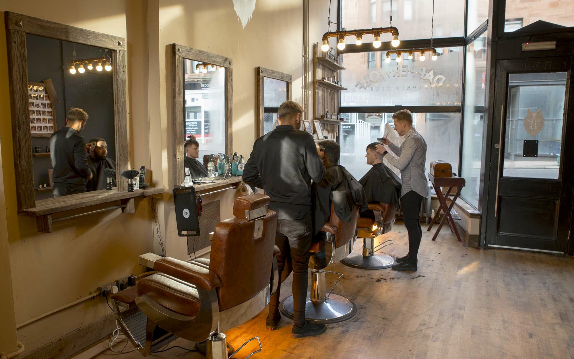 In Glasgow, there are many barbers with different atmospheres: urban, modern, retro, alternative… There is always a perfect place to tame my hair and my beard! On the High Street, I noticed this shop, “Dapperwolf”. Leather armchairs and wooden floors make you want to come in. In addition, the steam on the window indicates that it is hot inside! It’s decided, I’m putting my hiking bag down. The barber greets me and asks what he can do for me. No need to think: I want a haircut and a beard worthy of Sir Edward’s !