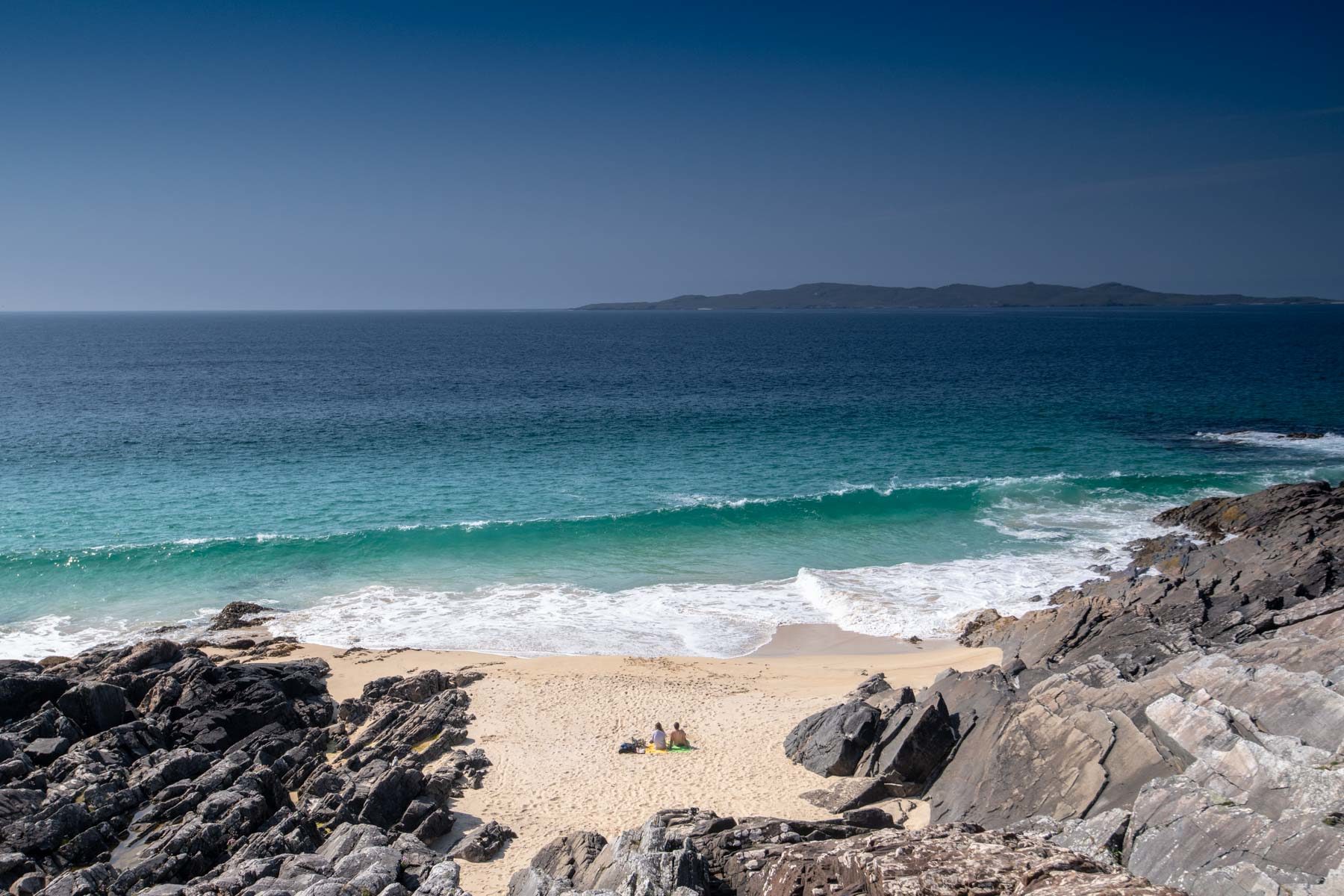I really like this little cove. It takes a bit of climbing to get there, but once down there you can admire the spectacle of nature. In the distance, we can see the Isle of Taransay with its rock, peat and heather landscapes.