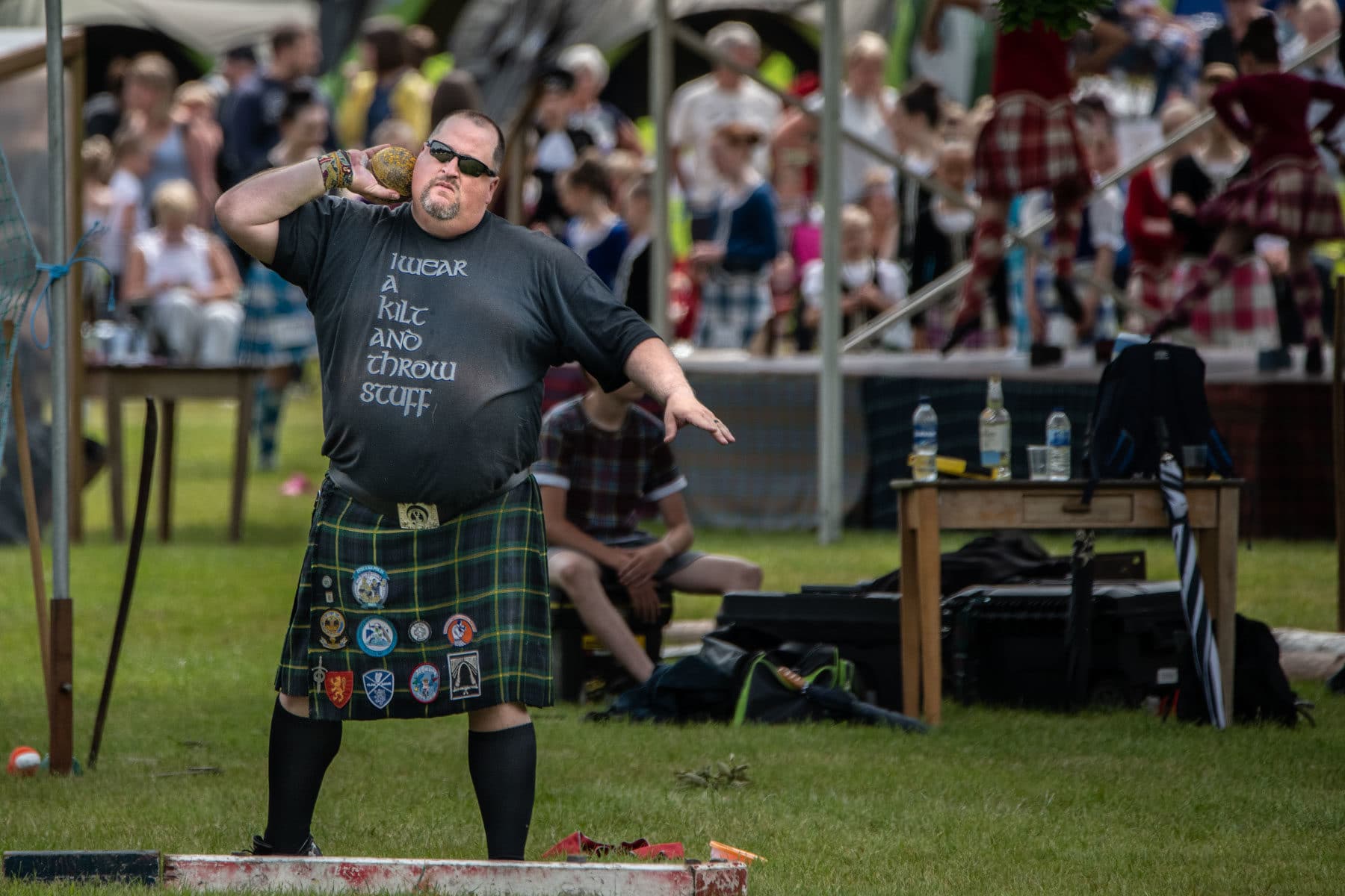 In Scotland, from May to September it’s the Highland Games season. No less than 62 competitions are organised. Each one lasts one day, during which a large number of events take place: bagpipe competition, running, traditional dances, etc. Me, I love the showdowns. They go back to the origin of these games, born probably a thousand years ago. For the clans, the goal was at the time to test the power of its members and their agility. Even today, the showdowns are spectacular. Participants throw weights, hammers and tree trunks! Some athletes are really impressive. While having a sense of humour. With his t-shirt, this one made me laugh. With the other participants, he spent the afternoon in kilt throwing all sorts of weights, under the watchful eye of the crowd. « I wear a kilt and throw stuff » summarises the situation very well! I wish I had the same t-shirt!