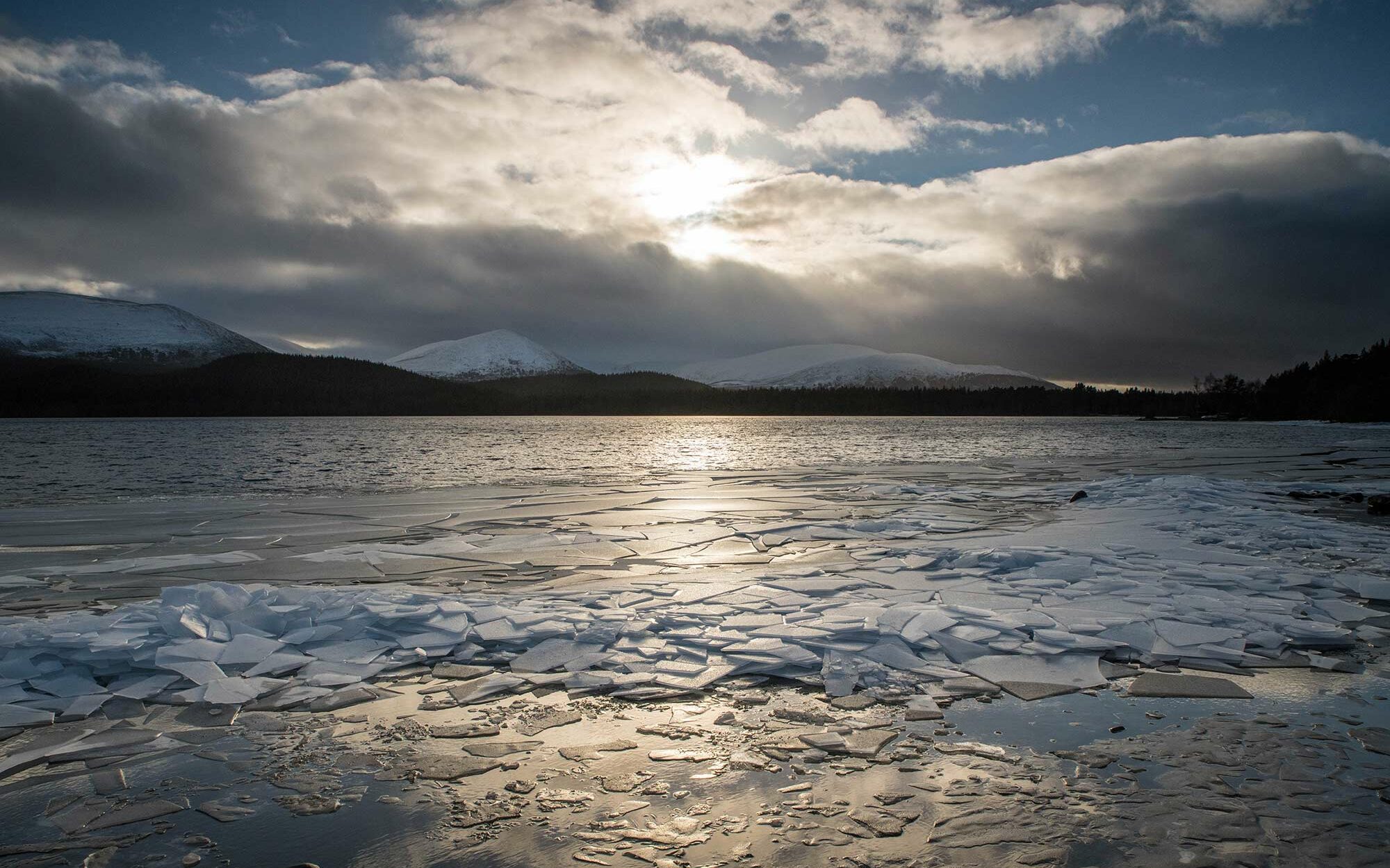 Loch Morlich is a great place for kayaking and water sports in the summer, there is even a water sports centre, and in the winter, the waters of the loch look like a broken mirror ! In the centre of the loch before me, the waters continue to flow. No chance of seeing them freeze. But all around the loch, stagnant water is trapped in the cold. As a result, the current in the centre of Loch Morlich stirs the ice without stopping and breaks it into a thousand pieces. I stop by Loch Morlich as the sun goes down. Now the sky is blue but the dark clouds announce that the weather will soon turn. Rain, snow, hail, sun: as the Scots say, if you do not like the weather, wait 30 minutes! Incredible lights remain, reflected in the ice. For the night, I go back to Aviemore, a true base camp for hikers in the northern Cairngorms.