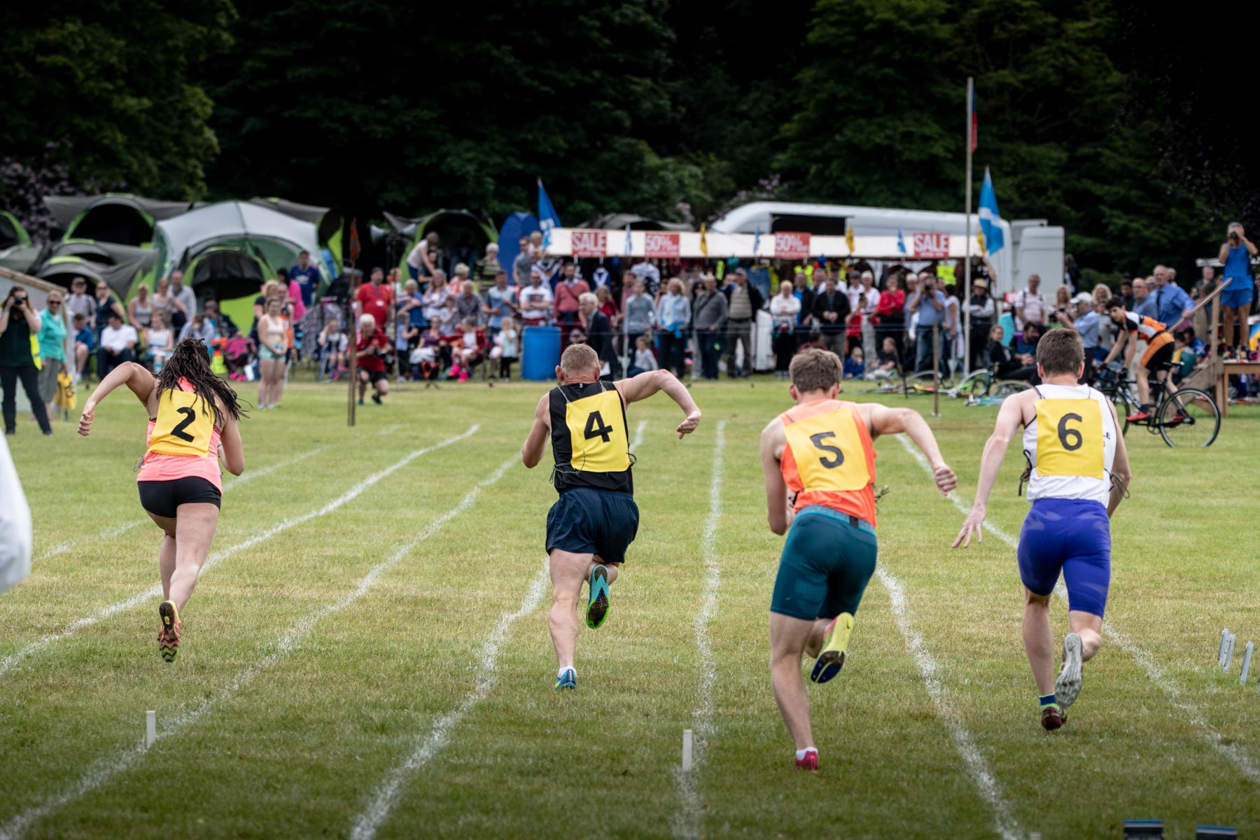 When I discuss the Highland Games with friends, they often tell me about tug-of-war or trunk throwing. They’re part of these games’ events, but there are many more! Running is a classic. At Strathmore Highland Games, the athletes compete on 90, 200, 800 or even 3200 metres. There are also relay races. Before starting, the runners arrive a long time in advance. For long minutes, I saw them stretch and especially warm up their ankles. The race takes place on turf that is perfectly trimmed, but less stable than an athletic track. Despite the mandatory spike shoes, it is also more difficult to find support. Each runner is there to surpass themself, under the watchful eye of an audience of connoisseurs. I was part of them!