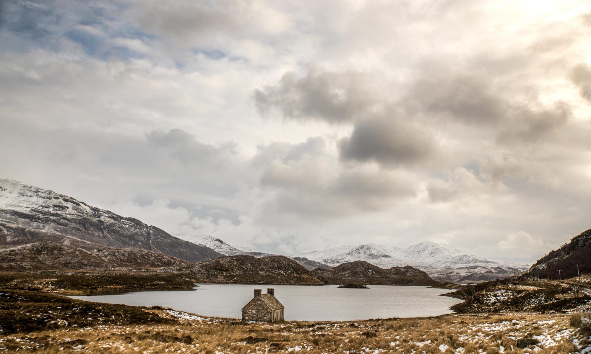Loch Stack is a fishing spot in the Sutherland region. There are trouts as well as salmons. The salmon reaches the loch via the Laxford River, and you can catch them as early as May, but I was told the best period is from June to October. For the moment, I do not see many people, the fishing season has not started yet! Loch Stack is a beautiful expanse of dark water. It extends for more than 6 km, in the middle of the mountains, including the majestic Ben Stack, which exceeds 700 metres in altitude. This little stone house is a welcome shelter. In the sky, more clouds are appearing. If it snows again, I’ll knock on the door.