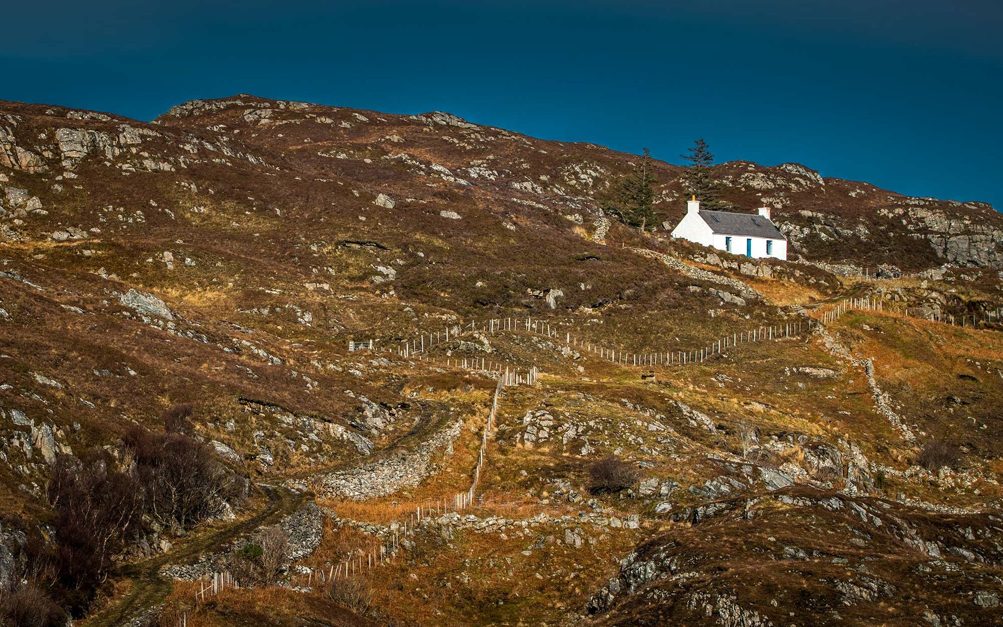 There are not a lot of people in the Assynt region, but the coastal road from Lochinver to Kylesku is worth the trip – it’s called the Drumbeg road, the B869. Over 30 km, you drive through hills, 25% slopes and cut coast. And in the middle of nature, I saw this white cottage stick out from the mountain. The rays of the sun were bringing out the white paint, while a big black cloud loomed. I did not meet its inhabitants, but I imagine they are breeders or poets ! Maybe both at the same time. Scotland is a nation of poets. I went back on the narrow road without seeing many people. In winter, the Drumbeg road is almost deserted. In the summer, tourists use it to go to the nearby beaches of Achmelvich and Clachtoll. With their white sand, they are little bits of paradise!