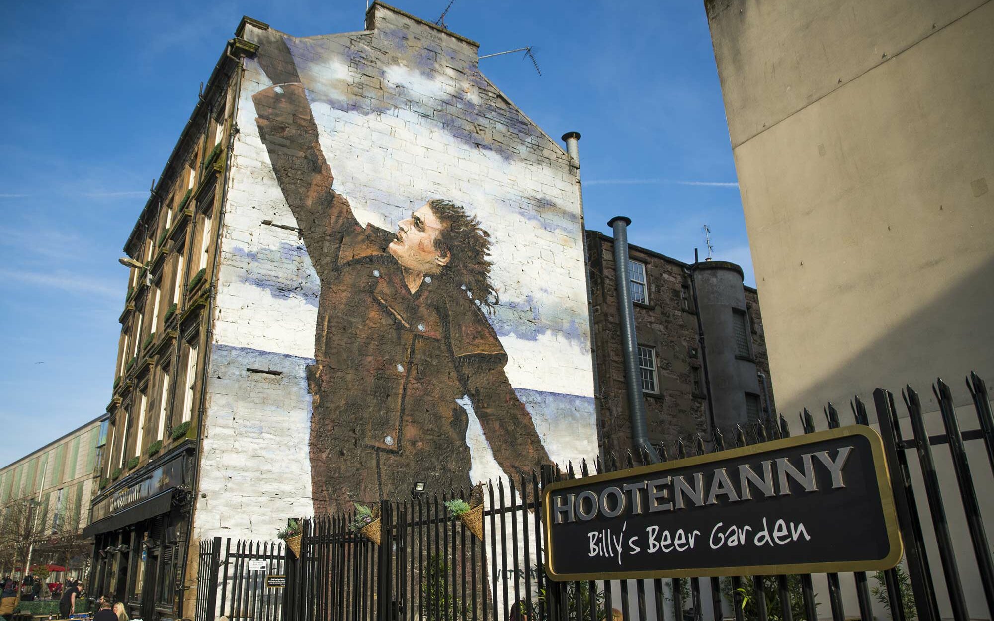 Para saber si salen en camiseta, jersey o con abrigo, los escoceses tienen un termómetro diferente al resto del mundo. En Glasgow en pleno invierno, he visto al mismo tiempo a turistas con gruesas bufandas y a un escocés con pantalón corto. Parece ser que el frío es algo psicológico. Haga 5 o 25 °C, podemos ver a los habitantes de Glasgow disfrutar del Billy’s Beer Garden. Debo decir que es también uno de mis preferidos. Los Beer Gardens son espacios en el exterior de los pubs, donde nos podemos sentar a tomar una copa. El Billy’s Beer Garden es un homenaje al genial cómico de Glasgow, Billy Connolly. La pintura mural se realizó para celebrar los 75 años de este gran hombre. Ante este impresionante homenaje, me dan ganas de decir «¡Salud Billy!».