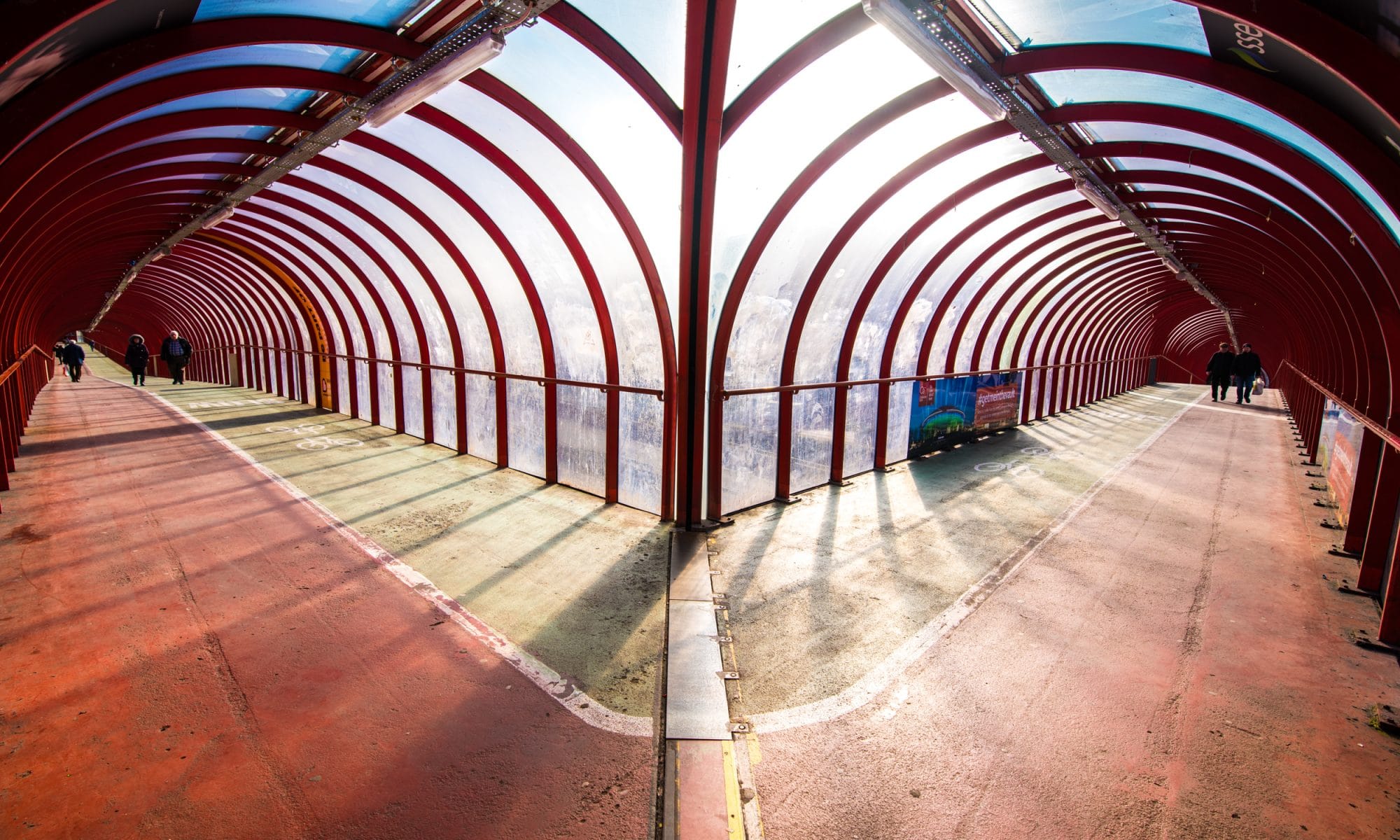 À Glasgow, il pleut souvent. C’est pour cela que ce passage est très pratique. Depuis le métro, on le prend pour aller du parc des expositions jusqu’au « SSE Hydro », une grande salle de concert située sur les rives du fleuve Clyde. On a l’impression qu’il n’en finit jamais ! Une fois à l’intérieur, on peut marcher 5 bonnes minutes sans avoir à se tremper. Là, il y a un rayon de soleil, mais ça ne va sans doute pas durer ! Ce passage abrité peut être emprunté par les piétons et les vélos. En Écosse, on est très respectueux des règles de circulation. Les piétons traversent sur les passages cloutés et les vélos ne roulent pas sur les trottoirs. J’en vois deux qui ne marchent pas du bon côté. Ça doit être des touristes. Si un vélo arrive, ils ne vont pas tarder à se faire recadrer !