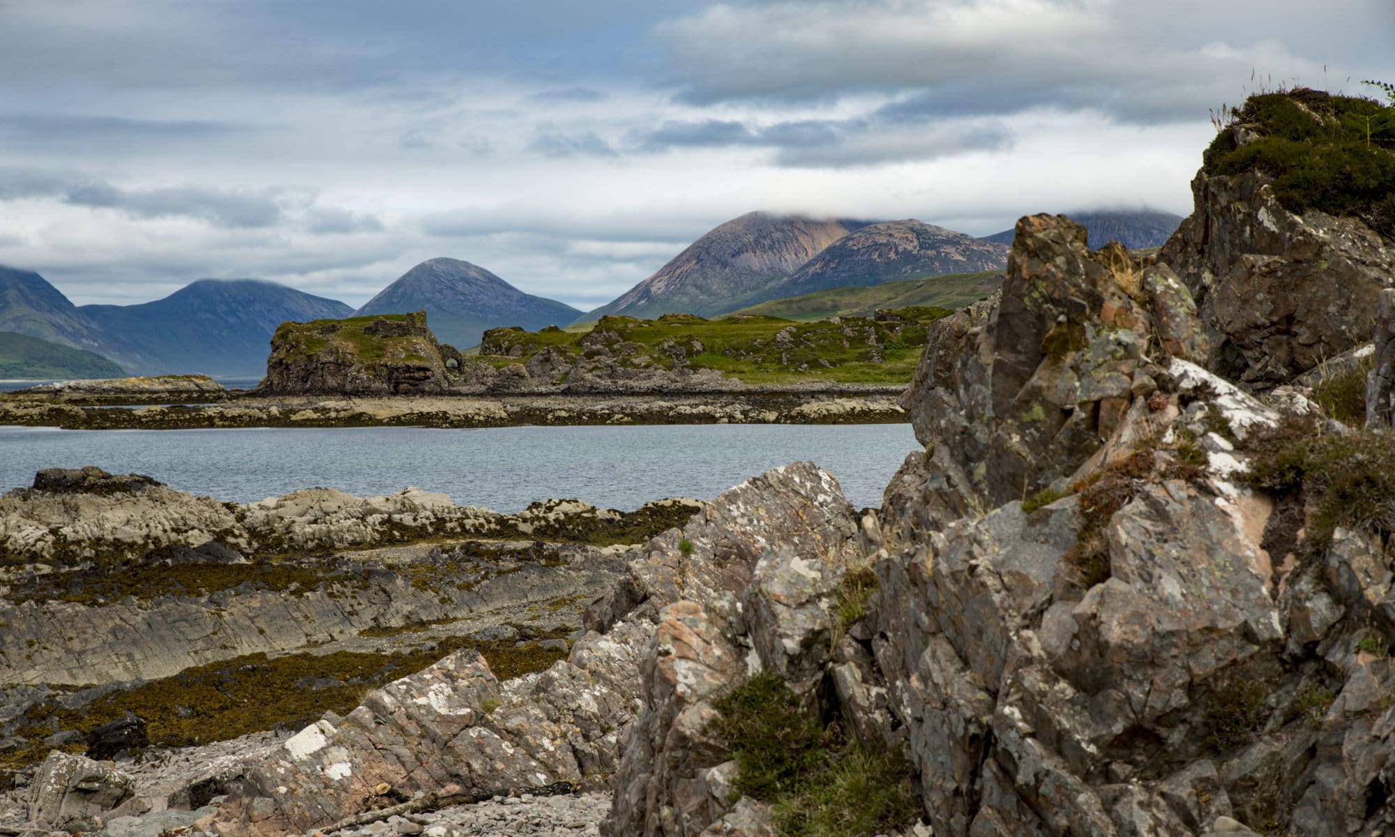 La marée est basse sur l’île de Skye. Au second plan, le rocher à la pointe s’est bien découvert. Il y a 5 siècles, le château de Dunscaith s’y dressait fièrement. Il n’en reste que quelques ruines, mais ce château est très intéressant. Selon la légende, il a été construit sur un emplacement bien précis : la forteresse de Scáthach. À ce qu’on m’a expliqué, Scáthach est un personnage fascinant de la mythologie des Celtes. Femme maîtrisant l’art de la guerre, elle recevait des apprentis héros, pour les rendre invulnérables. Son élève le plus célèbre est Cú Chulainn, l’un des plus grands chevaliers de la mythologie irlandaise. C’est donc à l’endroit où je me trouve que Cú Chulainn a appris à se battre. Au terme de son initiation, Scáthach lui a remis une arme magique fabriquée avec les os d’un monstre marin. Je me mets à rêver à toutes ces histoires. Une magicienne, un guerrier légendaire, un monstre marin … Devant ce paysage fantastique, tout me semble possible !