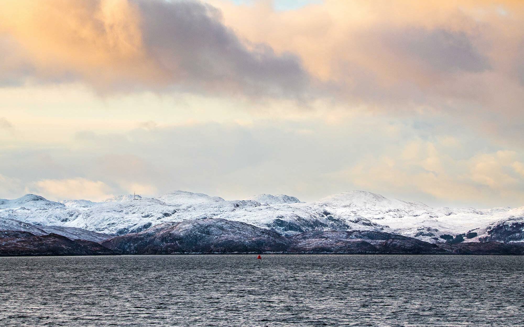 Le Loch Ewe est un loch de mer, cerné par les montagnes. Devant moi, je vois l’île d’Ewe, qui fait bien 2 km de long. On a du mal à la distinguer des montagnes enneigées juste derrière. Leur sommet, An Cuaidh, culmine à 296 m. Le Loch Ewe est vraiment spectaculaire. Je vous conseille d’y arriver en longeant le Loch Maree, qui communique avec le Loch Ewe. À seulement quelques kilomètres de la côte, j’ai traversé des montagnes dont les sommets dépassaient les 1000 m. Je me suis senti tout petit devant de telles merveilles ! Arrivé sur les bords du Loch Ewe, je ne savais pas de quel côté tourner ma tête. Partout, je pouvais ressentir la force de la nature écossaise. Ce matin à Aultbea, je regarde le lever du soleil. La lumière du soleil levant diffuse de magnifiques couleurs pastel.
