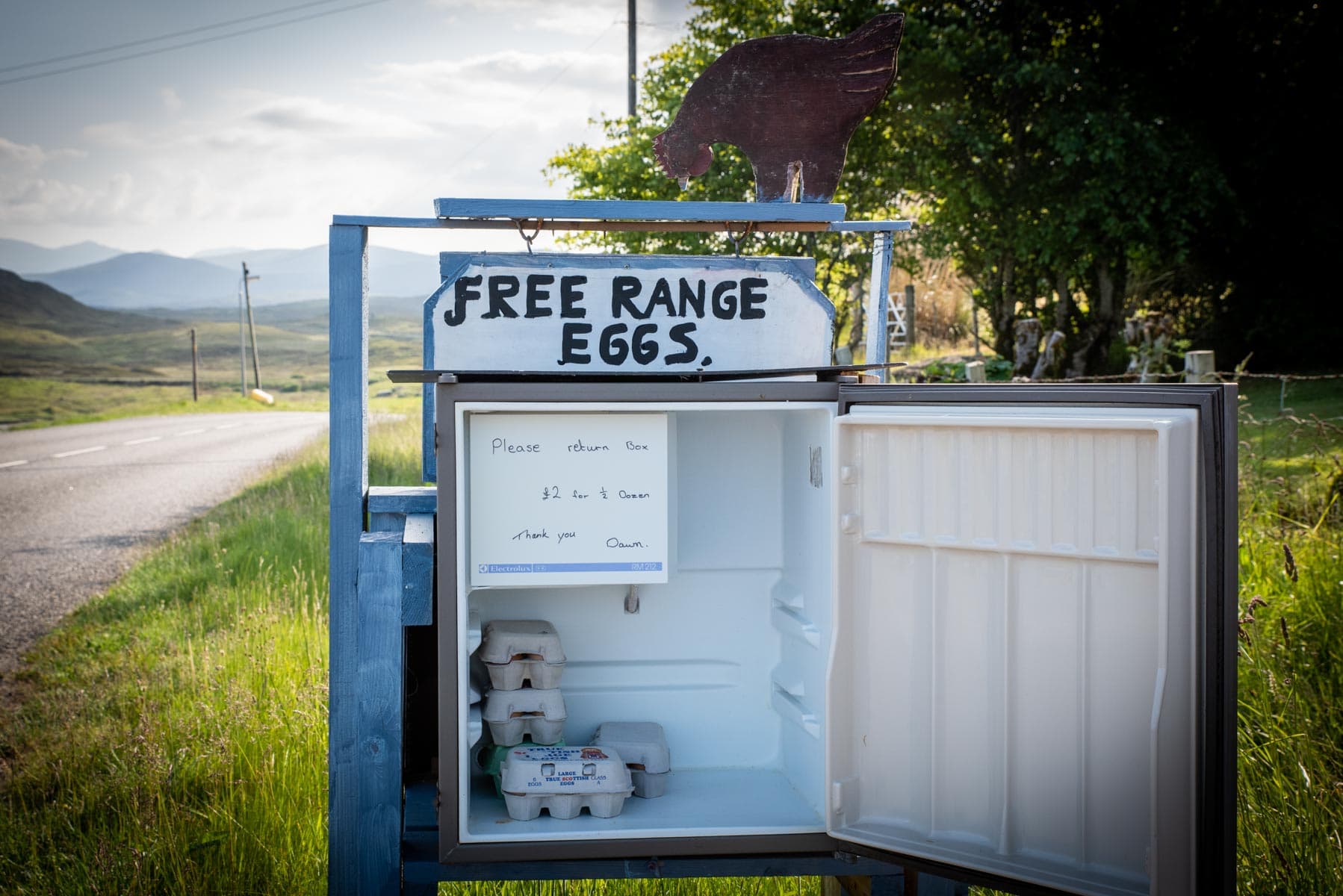 Le nom est un peu trompeur mais Lewis et Harris sont en fait une seule île. Lewis est au nord, tandis qu’Harris est au sud. Les deux parties de l’île sont très différentes : le nord est plutôt plat tandis que le sud est très vallonné. Leur point commun est d’être peu habitées ! Sur Lewis et Harris, on compte moins de 10 habitants par kilomètres carrés. En dehors de Stornoway (Lewis) et de Tarbert (Harris), on peut parcourir des dizaines de kilomètres en ne croisant que des moutons et quelques hameaux. Les insulaires se sont donc adaptés. Sur ma route, je croise des petites cabanes marquées « œufs de poule élevées en liberté ». Ce sont des œufs en libre-service. Sur une île comme celle-ci, les gens marchent à la confiance. Il suffit de mettre £2 dans la tirelire pour repartir avec six œufs bien frais. C’est pratique ! Voilà de quoi faire une belle omelette. Demain, il faudra juste que je pense à ramener la boîte.
