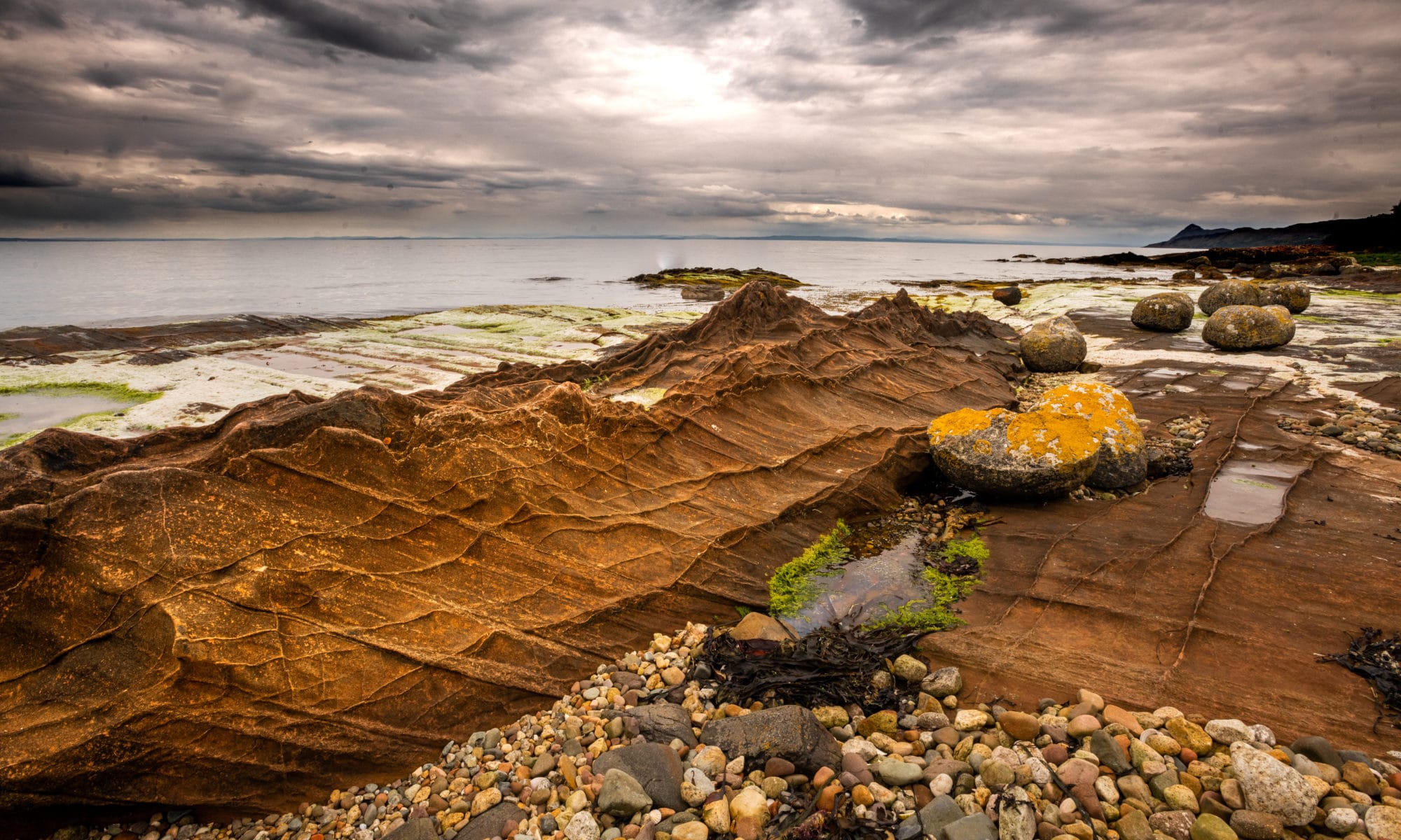 Ce matin, je suis parti de Brodick pour visiter Lochranza, au nord de l’île d’Arran. Sur la route, j’ai eu la surprise de voir ces formations étranges. Ici, le sable s’est solidifié, créant sur plusieurs kilomètres des plis et des crêtes. Avec les nuages noirs, les algues vertes et le grès rouge, le tableau est saisissant. Presque hors du monde. Avec un peu d’imagination, je trouve que ça ressemble à des grosses écailles, on dirait de la peau de dragon ! Comme toute l’Écosse, l’île d’Arran a son lot d’histoires de fantômes, mais a priori aucun dragon n’y a jamais séjourné. C’est bien dommage. Avec de tels paysages, quelqu’un devrait inventer une histoire et la raconter !