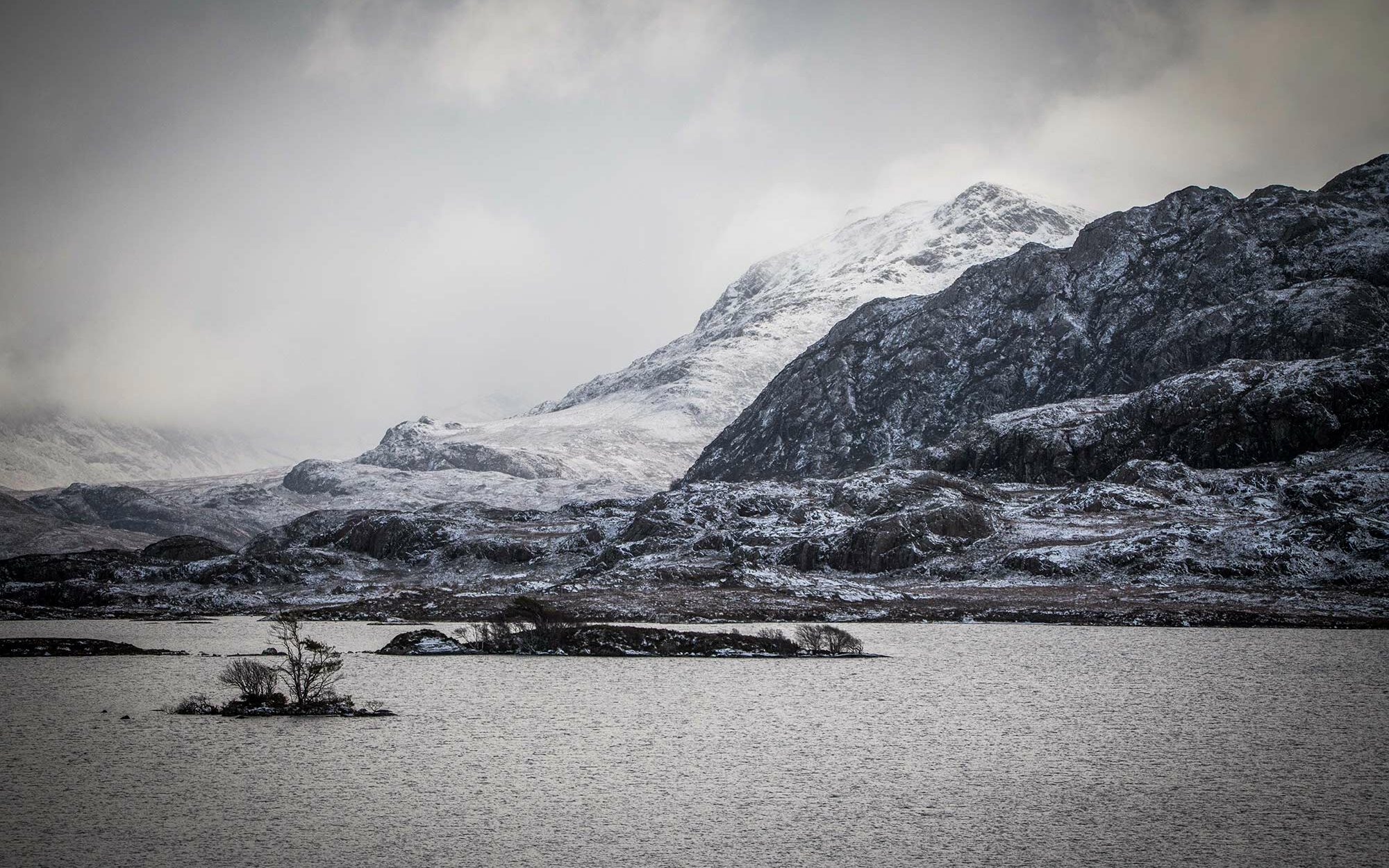J’aime bien cette photo, je trouve qu’elle représente bien la météo d’hiver dans le nord des Highlands. À quelques mètres près, on peut traverser une tempête de neige ou bien être quasiment épargné. Au premier plan, la colline au bord du Loch Tollaidh s’en est bien sortie, tandis que le nuage continue de s’accrocher sur la montagne située juste derrière. Il faut être très prudent lorsqu’on circule l’hiver dans les Wester Ross. Il peut y avoir un soleil éclatant et brusquement, la neige peut nous surprendre. Comme me l’a dit avec humour un Écossais, il peut y avoir de « légers » problèmes d’accessibilité. La solution est donc de vivre au rythme de la nature. S’il neige vraiment beaucoup, on attend que ça s’arrête et que les engins chargés de déneiger passent. En fonction des chutes de neige, ça peut être rapide ou prendre plusieurs jours. L’hiver, dans le nord des Highlands, on apprend la patience !