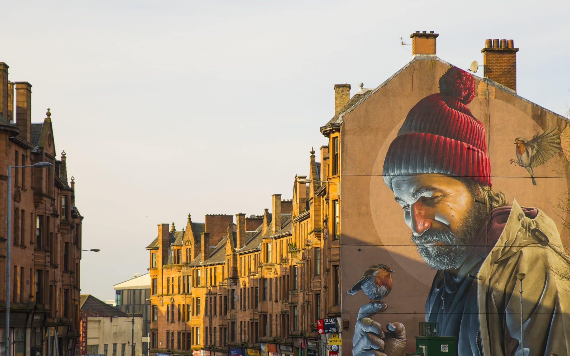 À quelques pas de la cathédrale de Glasgow, je tombe sur ce barbu qui tient un rouge-gorge sur le doigt. Cette peinture murale a le don d’adoucir la rue. Je me bouche les oreilles pour échapper aux voitures. Et en me concentrant, je peux presque entendre les piaillements des oiseaux. Après une petite enquête, j’ai découvert le nom de l’artiste. C’est Smug, de son vrai nom Sam Bates. Smug est un artiste de rue australien, basé à Glasgow. Plusieurs artistes de la ville se sont taillé des réputations internationales. Il en fait partie. Sam Bates est connu pour son style réaliste. Il aime aussi mettre de l’humour dans ses créations. J’en ai vu plusieurs dans les rues de Glasgow. J’aime beaucoup la fille géante qui semble attraper des passants. C’est dans Mitchell Street, je vous laisse le plaisir de la découvrir !
